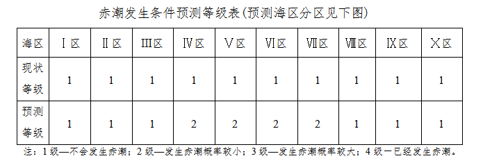 当前预报天气形势不利于我省沿海赤潮的发生。未来三天我省沿海赤潮发生条件预测等级见下表。