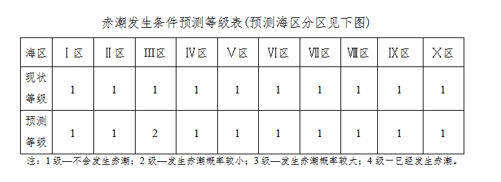 当前预报天气形势不利于我省沿海赤潮的发生。未来三天我省沿海赤潮发生条件预测等级见下表。