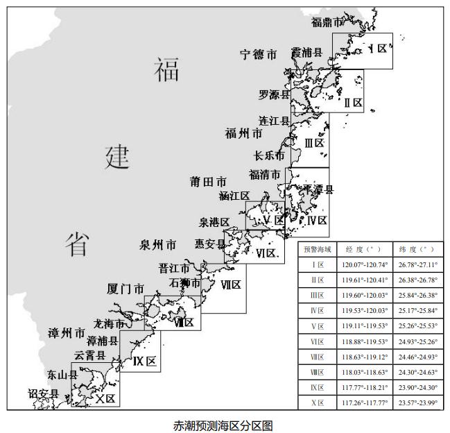 当前预报天气形势不利于我省沿海区域赤潮的发生。未来四天我省沿海赤潮发生条件预测等级见下表。