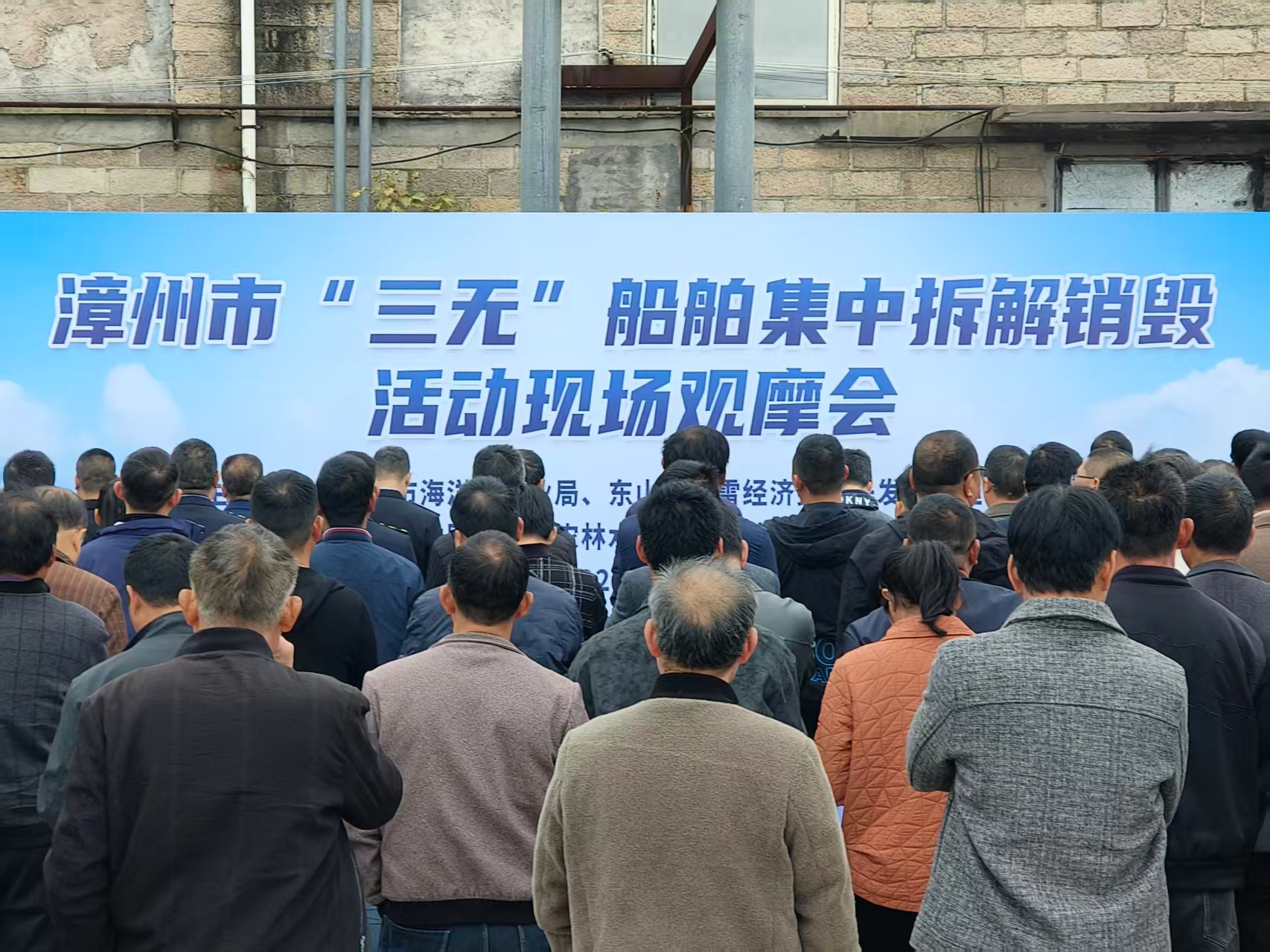 继1月7日至8日执法人员以“四不两直”方式突击检查57家船舶修造企业,并成功查获一批涉嫌非法建造空壳船后,1月30日,漳州市海上船舶安全管理协调机制组织有关县区,对查获并核查确认的29艘“三无”船舶进行集中拆解,市、县两级海洋渔业、公安、工信、市场监管等部门相关负责人及全市87家船舶修造企业负责人参加现场会,共同接受履行监管职责与合法合规经营的警示教育