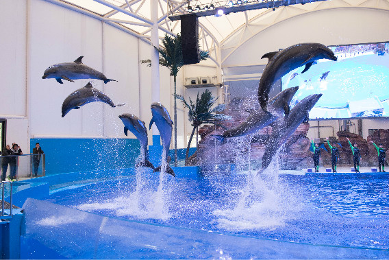离开鲨鱼王国来到海豚剧场,伴随着欢快的音乐,只见海豚精灵们摇曳身姿,从水中一跃而出,在海水中翩翩起舞,姿态优雅。