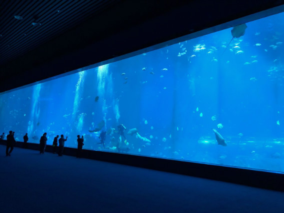 从生态雨林出来,不远处便是鲨鱼王国.据了解,里面有45块大小不同的亚克力观景窗,住着300余种、近30000尾海洋动物。一走进鲨鱼王国,眼睛所覆盖的视野居然装不下整个观景窗。隔着透明的视窗,海里世界的鱼儿们自由游翔。据工作人员介绍,这个巨幕是鲨鱼王国里最大的观景窗,也是目前世界最大的亚克力观景窗。
