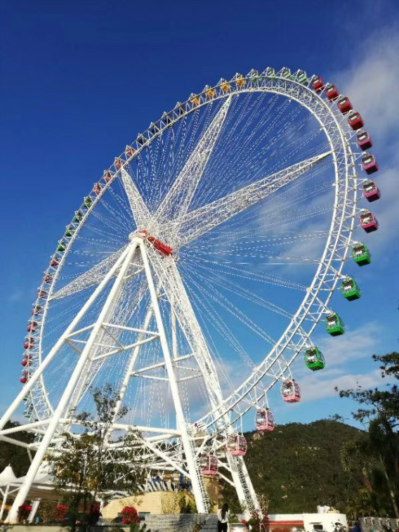 在270米的山头上乘坐直径88米的巨型摩天轮是什么体验?在天柱山,你会知道答案。该摩天轮被称为“漳州之眼”,也是天柱山欢乐大世界地标式游乐设施。当座舱慢慢往上转直到最高处,立于青山之巅,漳州美景净收眼底。
