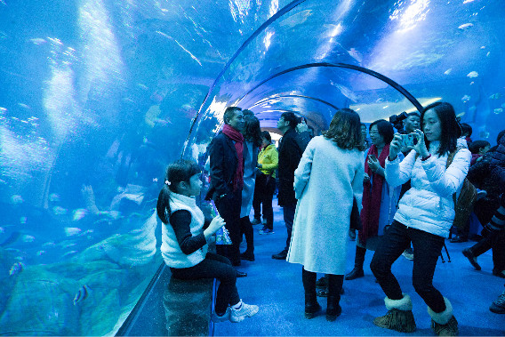 走到巨幕的尽头,转角就遇到一条超长的海底隧道,走在里面,印度洋海域、天平洋海域、南中国海、红树林等十种不同的海洋场景里生活着的各种缤纷珍奇的鱼类在身边游动。除此之外,这里还配套有海洋主题餐厅、儿童乐园与VR影院。