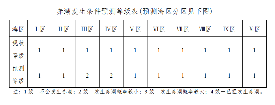 未来三天我省沿海赤潮发生条件预测等级见下表。